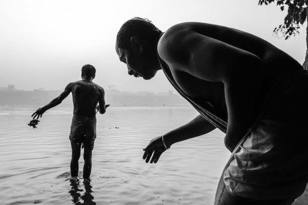 Prayer and ablutions on the ghats of the Hooghly River in Kolkata.