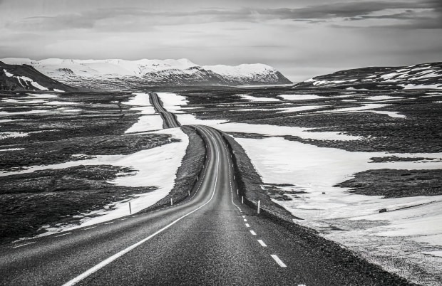 Title: Heading North on Highway One, Iceland. This image was taken through the windscreen of our hired 4WD whilst driving to the North of Iceland towards Husavik, in April 2023. Spring melt had commenced, resulting in the dramatic contrasts in the landscape. I am fortunate my husband prefers to do the driving, freeing me to capture the journey between stops, which along Highway #1 in many areas of Iceland are few and far between. Very narrow soft verges also negate pulling over regularly or safely. Needless to say, our 5-week self-drive circumnavigation of Iceland was amazing. Image shot using Canon 5D Mark IV, EF70-200mm f/2.8 IS II USM Lens, 1/3200sec @f/9.0, fl 75mm. (Why this lens and not a landscape lens you may ask? My landscape lens unfortunately ceased working on day one of our trip when shooting in minus 10 degrees conditions, so 70 - 200 lens certainly received a good work out!)