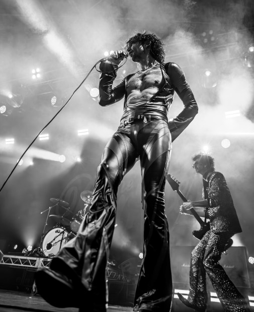 Captured from a low angle in striking black and white, this photograph immortalises Justin Hawkins, the charismatic lead singer of The Darkness, in a moment of pure rock god transcendence. With his signature high-octane energy and flamboyant style, Hawkins commands the stage, his silhouette cutting a dramatic figure against the backdrop of blinding stage lights. His posture embodies the essence of rock 'n' roll, making this image a timeless tribute to a true icon of the genre.