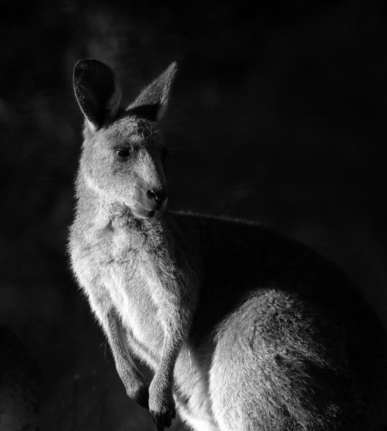 An Eastern Grey kangaroo in half shadow at Hobart Beach, south coast NSW