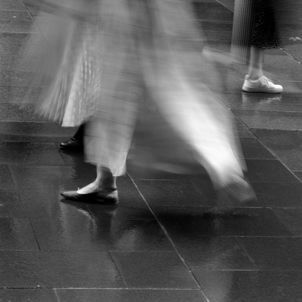 The contrast of sturdy shoes against the floating skirt. People moving in their own space.