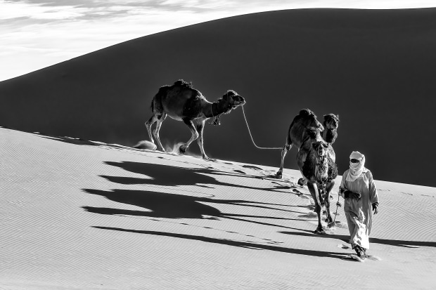 The sand dunes of Merzouga in Morocco are a place of stark light and shadow in the early morning, where camels and their drivers may be seen emerging from the rolling curves of the dunes.