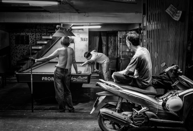 Life in the tenements in Saigon comprises a healthy mix of work and play. While their wives manage the stalls in the ground floor markets, these gentlemen make time to catch up with mates for a leisurely afternoon of pool playing.