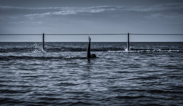 A swimmer doing laps is captured in a symmetrical seascape
