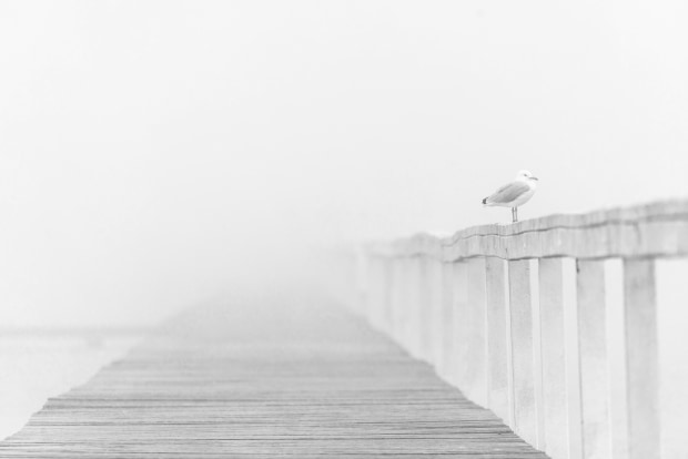 I was visiting friends up the central coast and woke up to a very foggy morning so decided to head out to Long Jetty Wharf. There was a seagull sitting on the rail watching me. I got out my zoom lens and captured the seagull enjoying the peace of being able to hide in the fog.