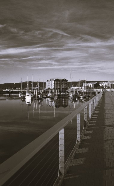 Seaport Launceston late afternoon. Taken with Mamiya Super 23, Mamiya Sekor 65mm lens, f11 at 1/60th sec. Ilford Pan F 50 asa film.