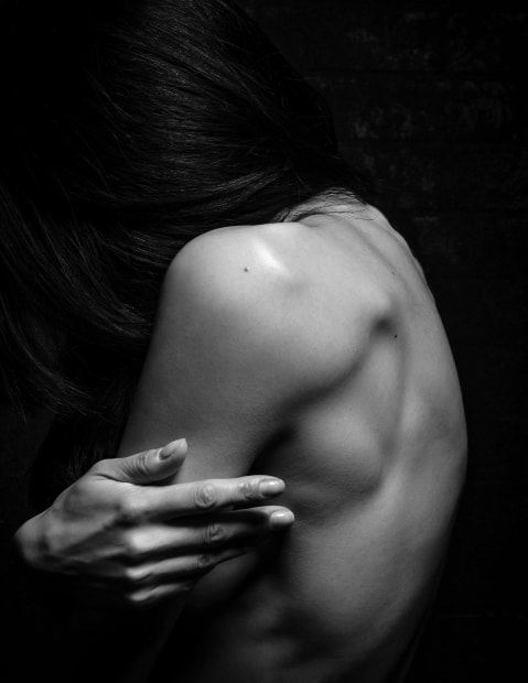 'Self-portrait, in shadow' depicts the implied vulnerability of engaging in self-portraiture as a delicate and deeply personal artistic practice. As the sitter, I bare my body and expose the sensitivities of my natural being while preserving some degree of anonymity. As the photographer, I direct light and shadow within the capture to reflect the emotion of my own presence. My hand resembling the making of my portrait from both sides of the lens, instructing and inspiring its very expression.