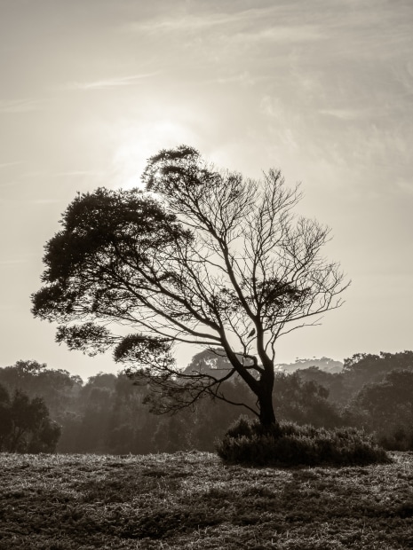 The wispy clouds help to diffuse the sunlight a little and positioning the sun behind the tree creates a pleasing silhouette of the tree with a bonus magpie perched on the lower branch making for an interesting element.