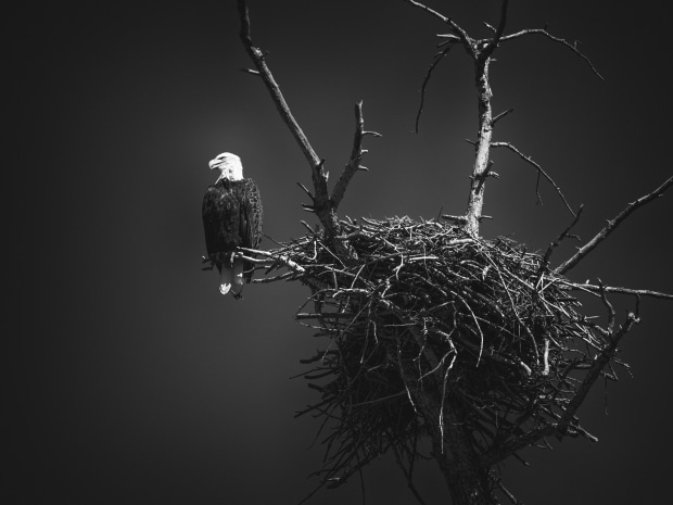 This magnificent raptor scrutinises its watery domain at Columbia Lake in Canada’s British Columbia. Perhaps waiting for its mate, perhaps its next meal? I have managed to sneak (if that’s even possible) in my sea kayak to near a position and just admire this North American icon. Perched in the upper boughs of its completely lifeless habitat, its nest no doubt made somewhat from the detritus of this very tree, which with hopefulness can withstand the rigours of the upcoming nesting season. Bald Eagles mate for life and build the largest nest of any bird on planet earth.
