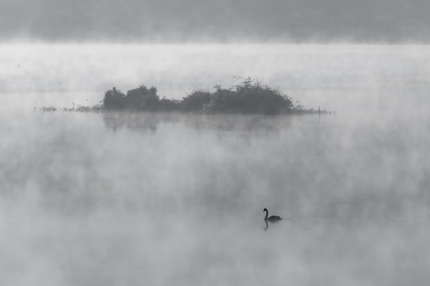 A beautiful misty morning on the lake creating a serene, almost enchanted atmosphere. The swan moves with quiet confidence, a symbol of both mystery and grace.