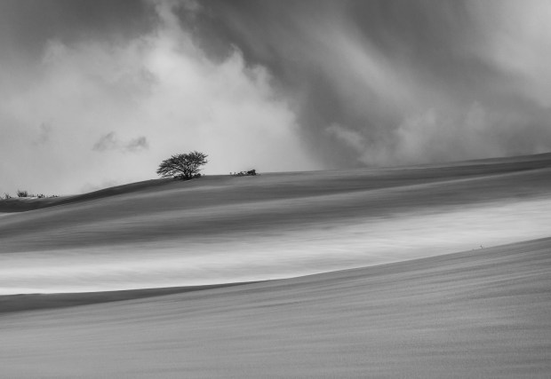 A lone tree high on a hill of snow delivers textures and shadows in Hokkaido Japan