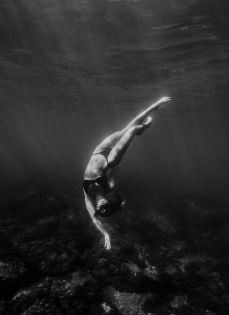This image is part of a larger series taken of Olympic Artist Swimmer, Zoe Poulis, swimming amongst the turtle colony of Cook Island Aquatic Reserve. I love the way that light works underwater and in this image shows the strength and beauty of her underwater choreography.