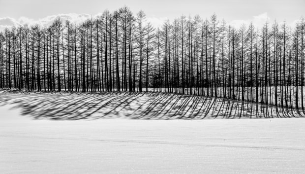 A forest of pines played shadows on the snowy foreground
