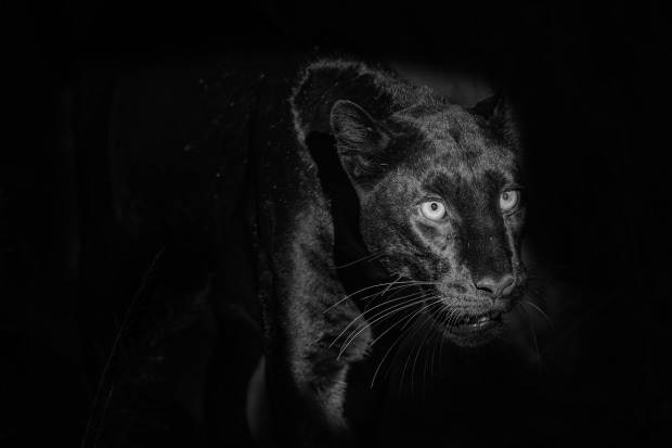 A rare black panther emerges from the darkness of Kenya’s Laikipia plateau, its obsidian coat barely distinguishable from the night. Melanistic leopards like this one are seldom seen in the wild, their elusive nature wrapped in myth and folklore.
