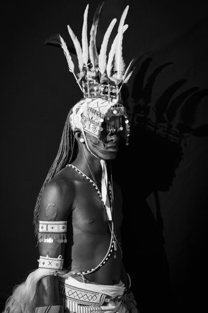 Proud Rendille warrior in late afternoon light in the remote Ndoto Mountains in Northern Kenya. His traditional beaded jewellery and elaborate feather headdress signifies he has gone through the rite of passage from boy to warrior. His long braided hair is an important symbol of status and manhood within the Rendille warrior culture.