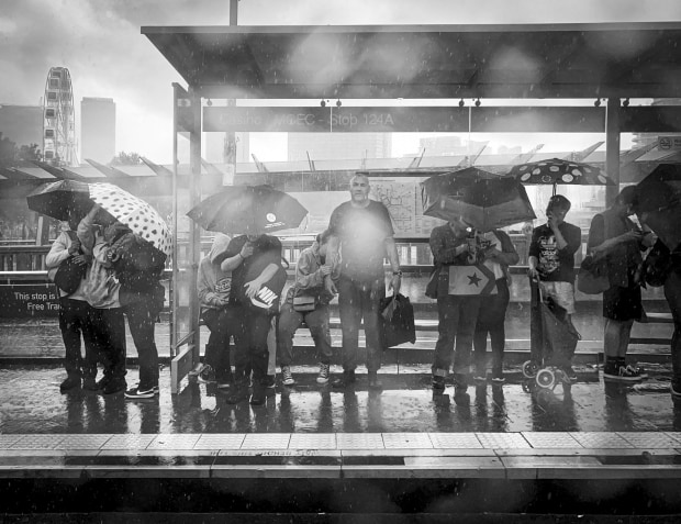Strangers huddled together beneath umbrellas at a city tram stop as rain pours down. The image captures an unspoken bond formed in the shared experience of waiting and weathering the elements, suggesting connection, vulnerability, and endurance.