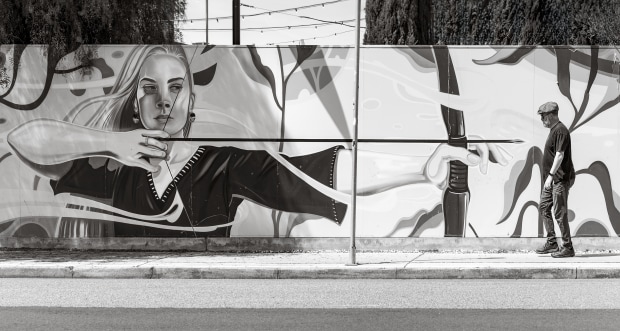 Man walking past mural of woman with bow and arrow, Port Adelaide, South Australia
