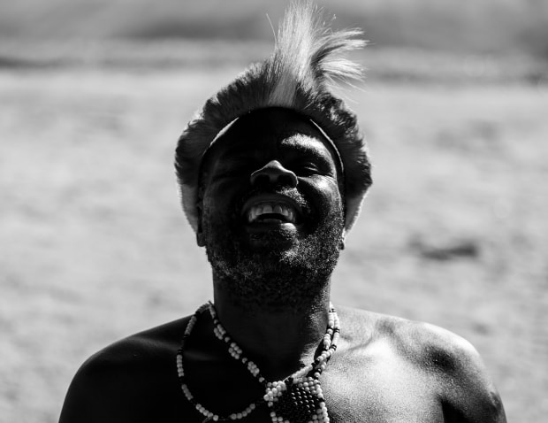 After just finishing his traditional warrior dance, a satisfied and happily exhausted Zulu performer takes a moment. Near Durban, South Africa