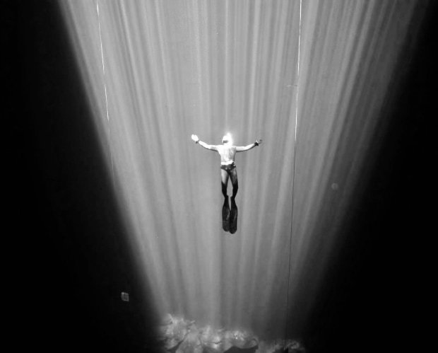 freediving in the Kibsby Sinkhole in South Australia one breath 30mts down with the light breaming thru the sink hole - just magic