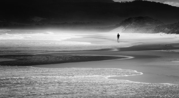 A man seeking solitude in the vastness of Adventure Bay, Bruny Island.