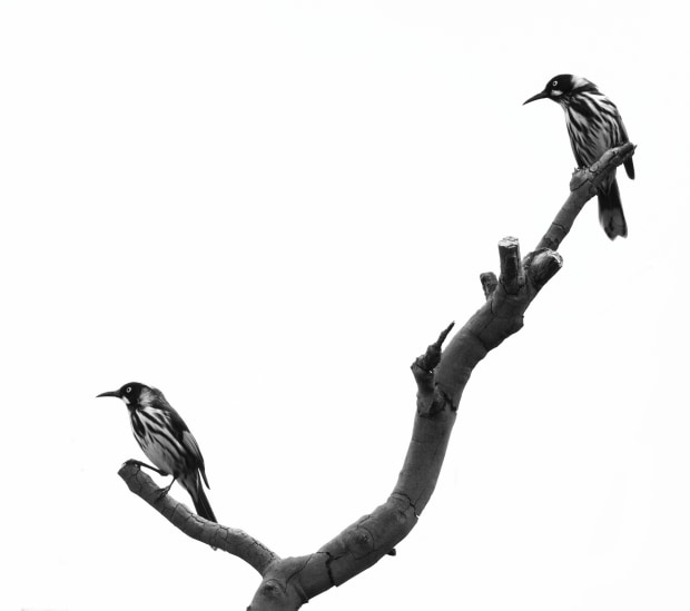 Two New Holland Honeyeater birds sitting on a tree at Hermitage heritage walk in Sydney, NSW.