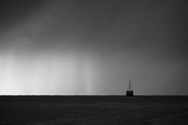 The vessel Milford Mariner off the entrance to Milford Sound, New Zealand, as a cold front moves through the region. Nikon Z8 and 100-400. The three-masted tourist boat is front-on to the camera and silhouetted against the sky. Image taken Thursday June 5