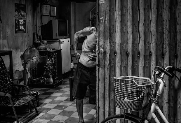 Homes in the Saigon tenements open directly into the alleyways, and privacy is not much of an option. In his well-pressed shorts, this elderly gent goes about his day, baring his torso to cope with the stifling heat.