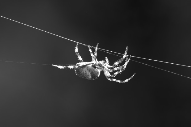 The backlight on this spider brings out the shine of its fine web and spikey fur features - it almost looks like it's walking a tightrope upside down.