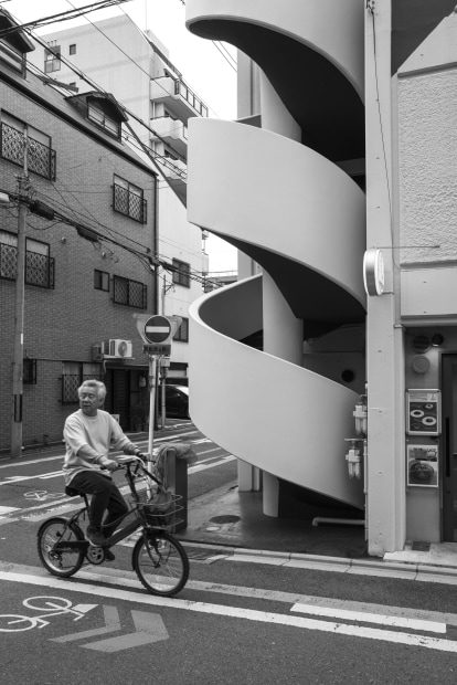 Spiral staircase on a street corner in Kyoto, Japan.