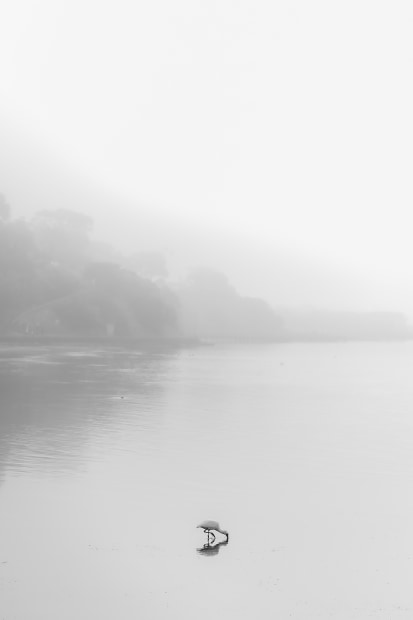 Enveloped by fog, a spoonbill searches for food in the shallows.