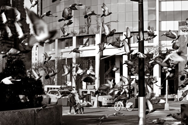 The moment a flock of pidgeons were startled on the streets of New York