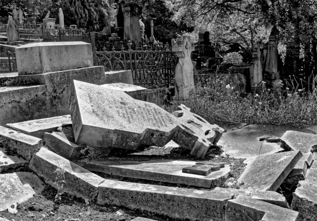 A photo taken in the Dunedin NZ Southern Cemetery, of a fallen tomb-stone bearing the words "Sacred".