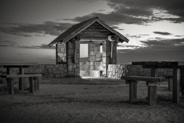 Photographed at Mount Buffalo National Park in North East Victoria, this stone shelter at The Horn on the southern side of the alpine plateau provides a window to the precipitous drop hundreds of metres below into the Buckland Valley. The textured granite and deep dark shadows almost demanded my final photograph was to be in black and white. The rustic picnic tables and strategically placed light provided an eerie addition to what is already a mysterious and moody location.