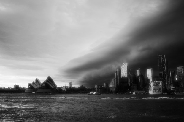 A storm passed over Sydney from the southwest during the early afternoon of Wednesday, 27 December 2023, bringing strong wind and sheets of rain. This photo aptly captures the ominous clouds bearing down on the city just before the storm broke. This image was originally shot in colour. Editing includes tweaking of lightness using curves, cropping and re-sizing, unsharp mask and application of infrared filter to produce the monochrome effect. Dust specks were cloned out.