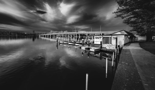 Storm clouds approaching at sunrise, The Entrance, NSW boat shed.