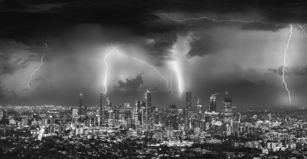 A collection of lightning bolts strike down on Brisbane's biggest storm of 2023 over an hour.