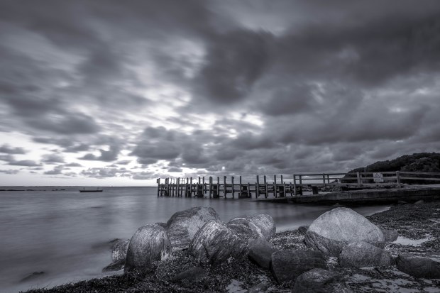 A stormy sky, rocks and the jetty in the early morning at Augusta on the south coast of Western Australia