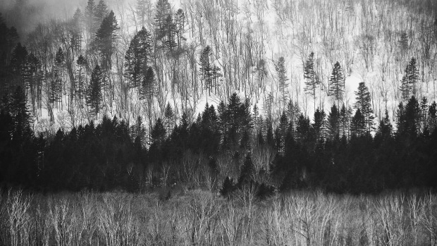 Nature forming its own stratification with the striking textural divide of winter forest in Hokkaido.