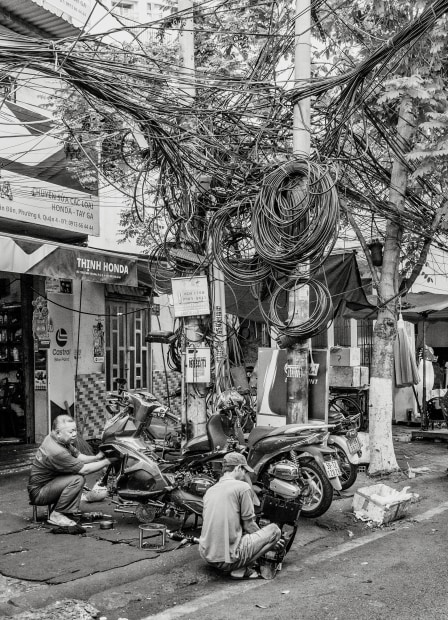 A Couple of motorcycle mechanics working on bikes in the street of Saigon under a tangled mess of electrical wiring overhead