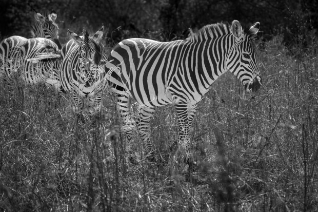 Stripes in the Savannah - zebras amidst tall, savannah grass. Stripped of color, the image emphasises the dramaticly the light and shadow across the animals' iconic black and white coats. The stripe patterns create a compelling visual rhythm, contrasting sharply with the aried tones of the surrounding dry foliage and draws the viewer's eye directly to the form, texture of the subject.