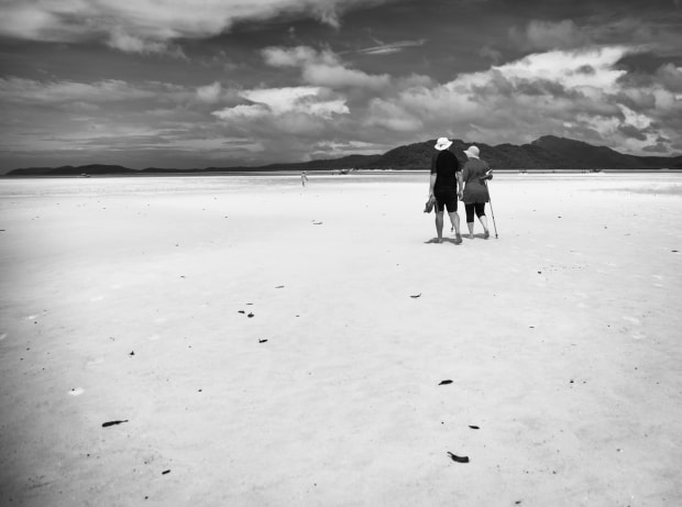 Two people strolling along the white sands of Whitehaven beach in the Whitsundays on a hot and humid day.