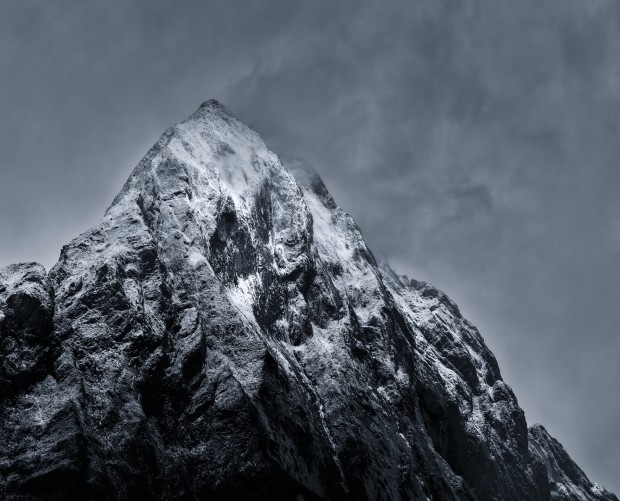 The sun breaking through to hit the summit of Mitre Peak , Milford Sound, NZ .