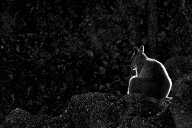 A Mareeba rock wallaby at Granite Gorge is beautifully backlit by the rising sun. Dust particles in the heat are floating in the air.