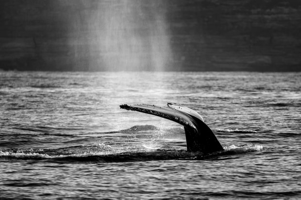 A humpback whale on it's annual northern migration, takes a dive, it's breath backlit by the late afternoon sun.