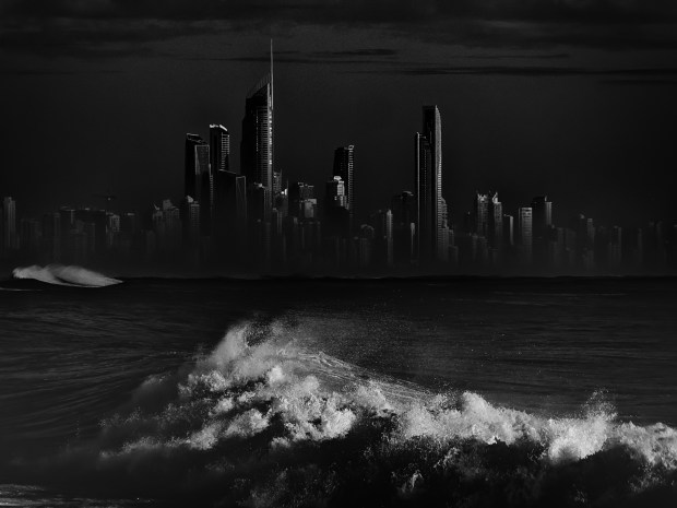 Surfers Paradise, seen from Burleigh Heads, with huge swells due to offshore cyclone heading towards Lord Howe Island.