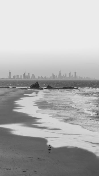 The peaceful afternoon view of Surfers Paradise from Elephant Rock Currumbin. The man walking along the beach towards the city to symbolise staying on track and always looking forward.