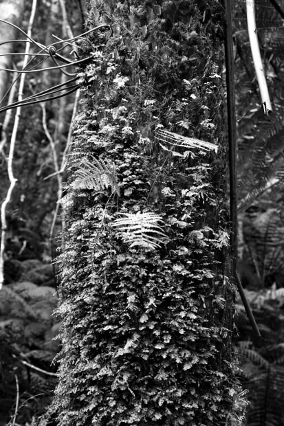 In a deep canyon in the Blue Mountains a tree fern, adorned with a variety of mosses and tiny ferns, captures the intricate tapestry of life and symbiosis in nature.