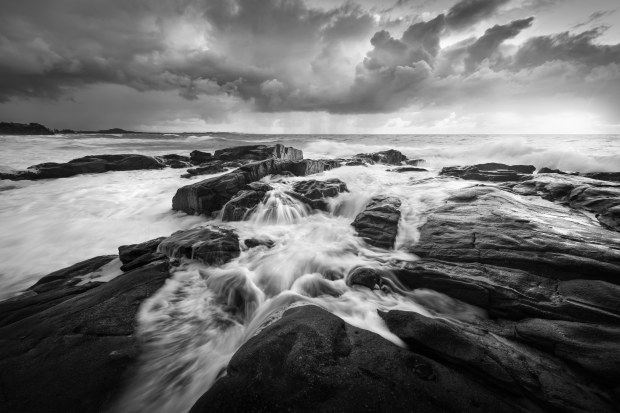 A pre-dawn squall charges in over Coolum Beach, forcing the retreating tide to sluice back through a jagged basalt gutter. This single 1/5 sec exposure balances fluid motion against the immovable volcanic shelf; careful dodging and burning lead the eye along the diagonal cascade toward the distant rain curtain on the horizon. Converted to monochrome to amplify texture and atmosphere, the image captures the raw energy that defines Queensland’s winter storm season.