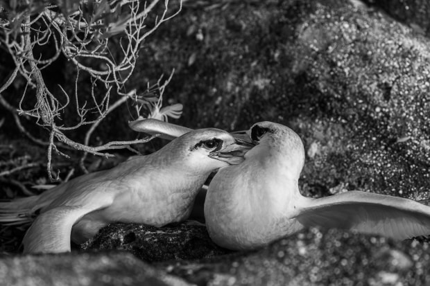 A pair of Red-Tailed Tropicbirds with bills locked together fighting over a nesting spot along the rugged coastline of Christmas Island