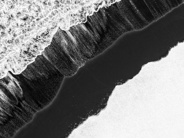 Black sand, white snow and white water have created a contrasting and textured landscape